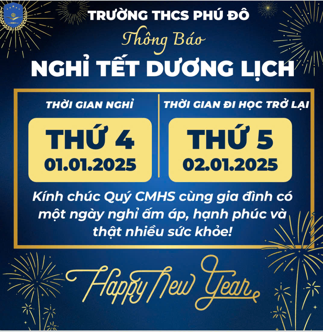 Trường THCS Phú Đô trân trọng thông báo: Học sinh nghỉ Tết dương lịch 01 ngày vào Thứ 4 ngày 01/01/2025. Học sinh đi học trở lại vào thứ Năm ngày 02/01/2025 theo thời khóa biểu. Kính chúc quý CMHS cùng gia đình có một ngày nghỉ ấm áp, hạnh phúc và thật nhiều […]
