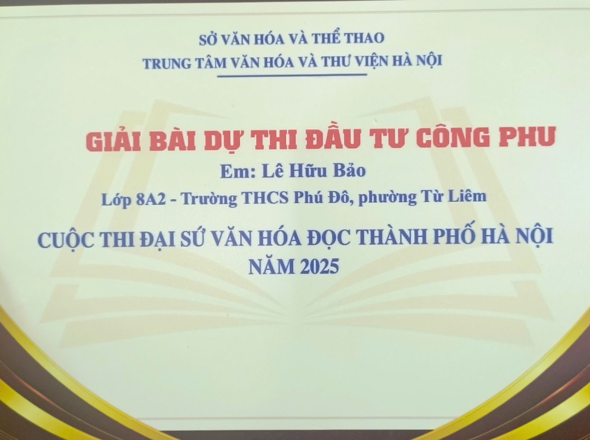 🏆 Vinh dự và tự hào, em Lê Hữu Bảo – học sinh lớp 8A2 đã xuất sắc giành giải bài dự thi đầu tư công phu trong cuộc thi “Đại sứ văn hoá đọc thành phố Hà Nội năm 2025”.