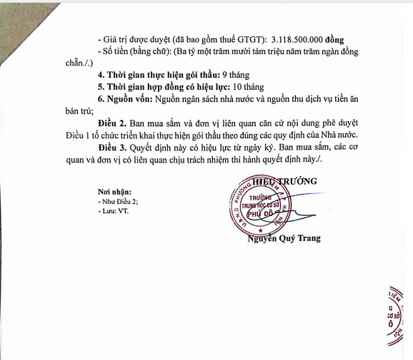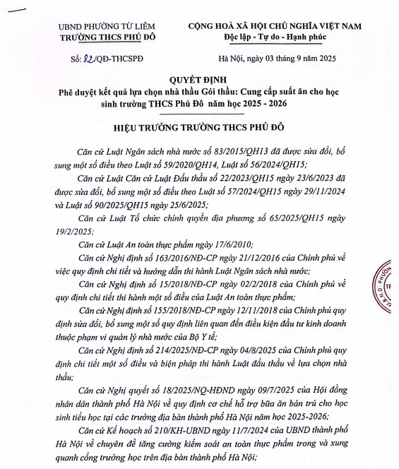 QUYẾT ĐỊNH PHÊ DUYỆT KẾT QUẢ LỰA CHỌN GÓI THẦU CUNG CẤP SUẤT ĂN NĂM HỌC 2025 – 2026