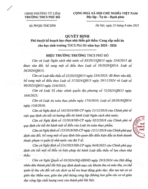 QUYẾT ĐỊNH PHÊ DUYỆT LỰA CHỌN NHÀ THẦU CUNG CẤP SUẤT ĂN NĂM HỌC 2025 – 2026